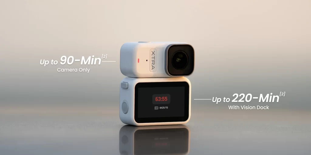 When longer runtime matters, connecting the Vision Dock adds a 1,300mAh battery, extending total operating time to 220 minutes (roughly 3.5 hours). That makes all-day travel filming, extended events, or long outdoor activities practical without constant recharging anxiety.