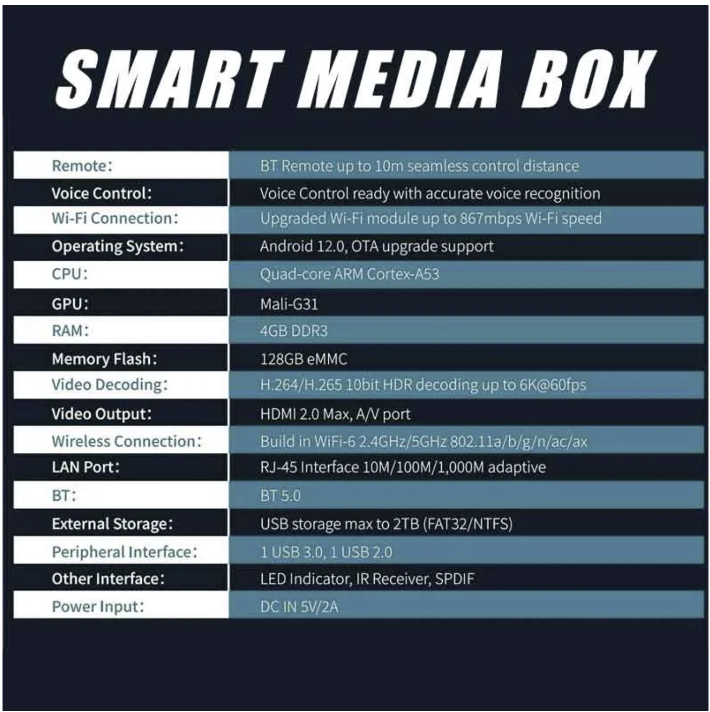 | External Storage: | USB storage max to 2TB (FAT32/NTFS) |